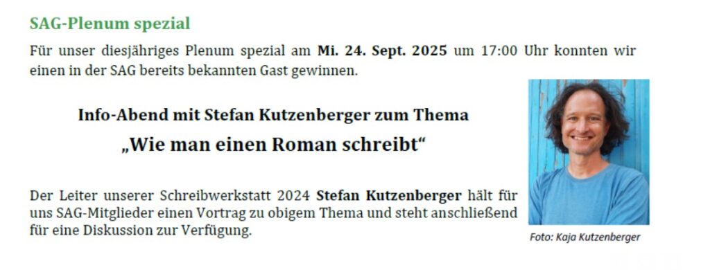 Am Mittwoch, den 24. September 2025, hat die SAG (Salzburger Autor:innengruppe) ihre Mitglieder zu einem Plenum spezial eingeladen. Zu Gast war Stefan Kutzenberger, der einen Vortrag zum Thema „Wie man einen Roman schreibt“ gehalten hat.